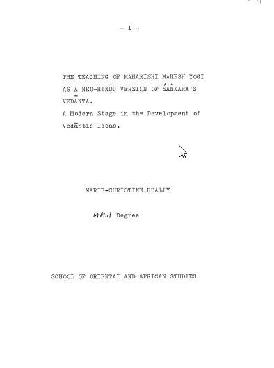 Esta tese (1983) examina a questão de saber até que ponto a pretensão de Maharishi ser um expoente autêntico do Vedanta de Sankara pode ser sustentada, e conclui que, embora o seu ensinamento esteja essencialmente de acordo com o de Sankara, difere deste na ênfase; além disso, Maharishi introduziu uma série de aparentes inovações, provavelmente devido a influências ocidentais modernas. Neste aspecto, a abordagem teórica de Maharishi também difere da de outros movimentos neo-hindus no Ocidente, a maioria dos quais ou são muito tradicionais, ou mais abertamente devocionais e religiosos.